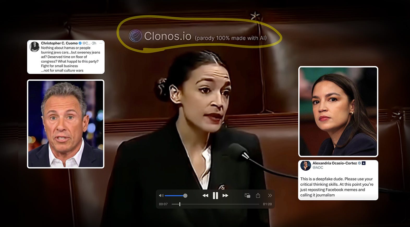The video came from a meme account, watermarked “parody 100% made with AI.” But Cuomo bought it anyway. AOC herself had to jump in and set him straight: “This is a deepfake, dude. Please use your critical thinking skills.”